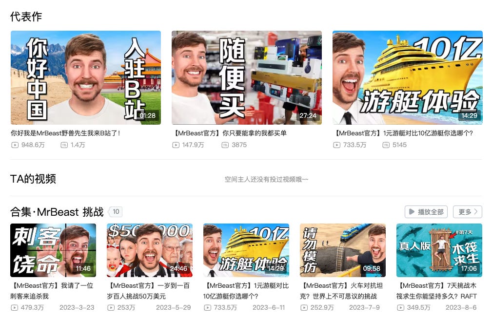His videos have already been clocking up millions of views on Bilibili for about a year on an unofficial channel operated by his mainland fans that Donaldson has now commandeered. Some of the videos that have already been posted to the Bilibili account include lavish spectacles such as 'Surviving on a raft for 7 days - How long could you endure?', '$1 Yacht vs $1 Billion Yacht - Which one would you choose?' 'Challenge: From one year old to one hundred years old, 100 people compete for $500,000' and 'I hired an assassin to kill me'.